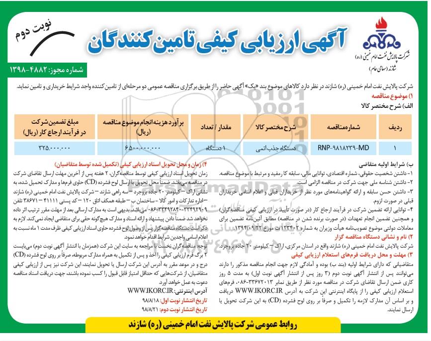 شرکت پالایش نفت امام خمینی (ره) شازند در نظر دارد کالاهای موضوع بند یک اگهی حاضر را از طریق مناقصه عمومی دو مرحله ای از تامین کننده واجد شرایط خریداری و تامین نماید