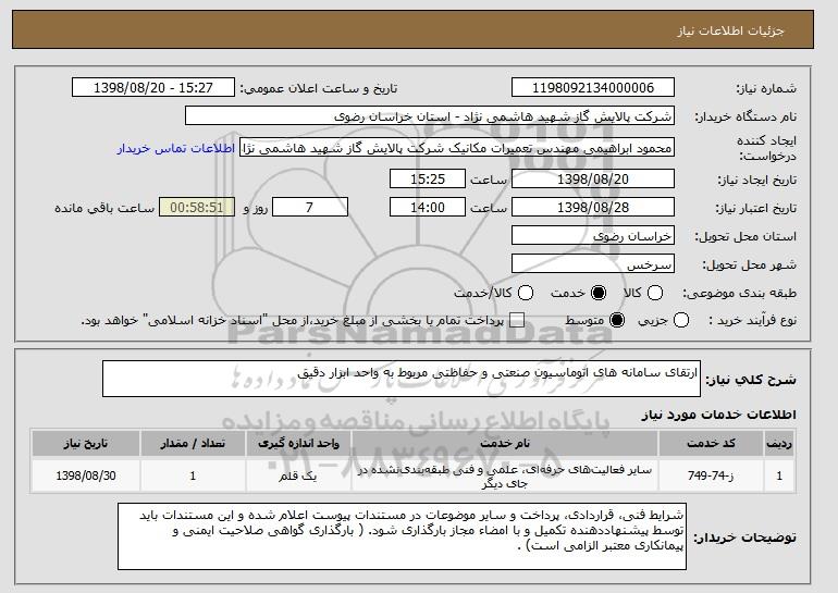 نام دستگاه خریدار:شرکت پالایش گاز شهید هاشمی نژاد - استان خراسان رضوی
