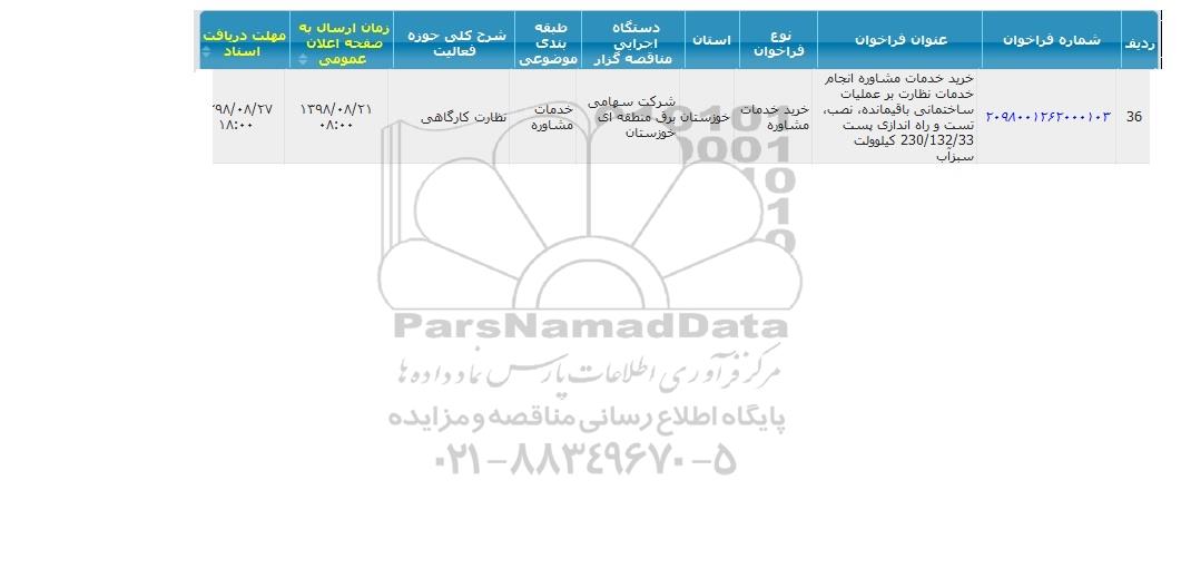 عنوان فراخوان: خرید خدمات مشاوره انجام خدمات نظارت بر عملیات ساختمانی باقی مانده، نصب، تست و راه اندازی پست 230/132/33 کیلو وات سبزآب