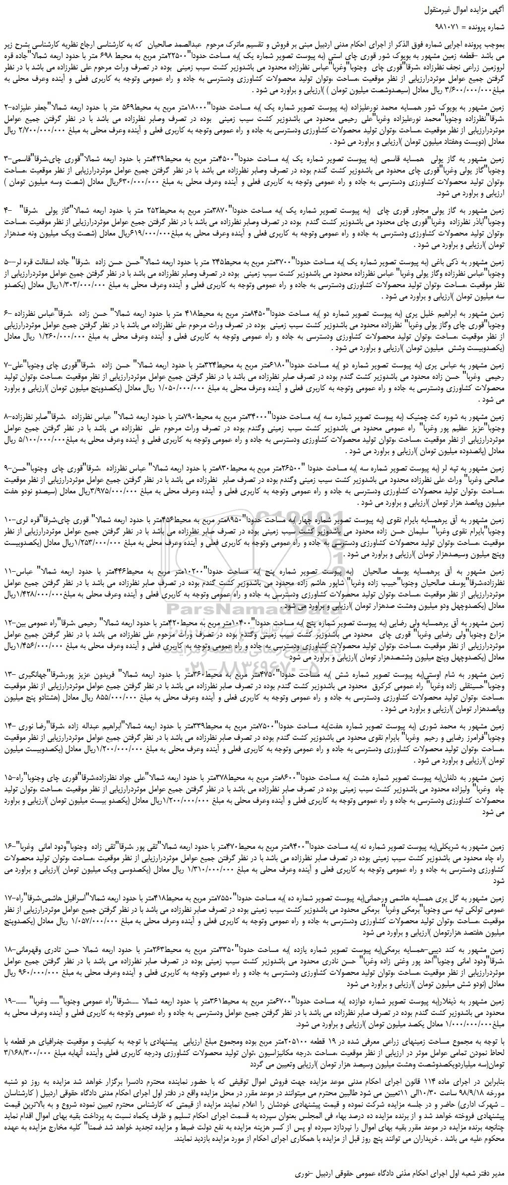 بموجب پرونده اجرایی شماره فوق الذکر از اجرای احکام مدنی اردبیل مبنی بر فروش و تقسیم ماترک مرحوم عبدالصمد صالحیان که به کارشناسی ارجاع نظریه کارشناسی بشرح زیر می باشد -قطعه زمین مشهور به بویوک شور قوری چای استی (به پیوست تصویر شماره یک )به مساحت حدودا"22500متر مربع به محیط 698 متر با حدود اربعه شمالا"جاده قره لروزمین زراعی نجف نظرزاده ،شرقا"قوری چای وجنوبا"وغربا"عباس نظرزاده محدود می باشدوزیر کشت سیب زمینی بوده در تصرف وراث مرحوم علی نظرزاده می باشد با در نظر گرفتن جمیع عوامل موثردرارزیابی از نظر موقعیت ،مساحت ،وتوان تولید محصولات کشاورزی ودسترسی به جاده و راه عمومی وتوجه به کاربری فعلی و آینده وعرف محلی به مبلغ3/600/000/000 ریال معادل (سیصدوشصت میلیون تومان ) )ارزیابی و براورد می شود .