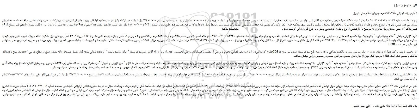 شماره پرونده اجرائی: 971375 شعبه دواجرای احکام مدنی اردبیل