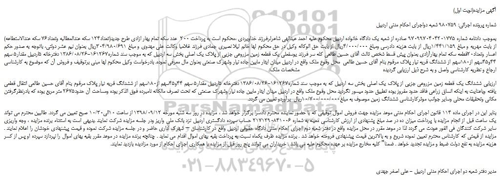 شماره پرونده اجرائی: 980759 شعبه دواجرای احکام مدنی اردبیل