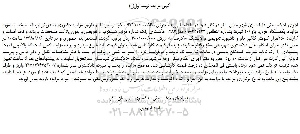 اجرای احکام مدنی دادگستری شهر ستان سقز در نظر دارد در رابطه با پرونده اجرائی بکلاسه 971106 ، خودرو ذیل را از طریق مزایده حضوری به فروش برساند.مشخصات مورد مزایده: یکدستگاه خودرو پژو206 تیپ5 بشماره انتظامی 334م22-61 مدل1384 خاکستری رنگ شماره موتور دستکوب و تعویضی و بدون پلاکت مشخصات و بدنه و فاقد اصالت و کارکرد 250هزار کیومتر گلگیر جلو و داشبورد تعویضی و لاستیک 90درصد به ارزش 300/000/000 ریال برآورد گردیده است.مزایده حضوری و در تاریخ 1398/9/16 ساعت10 در محل دفتر اجرای احکام مدنی دادگستری شهرستان سقزبرگزار میگردد،مزایده از قیمت کارشناسی شده بعنوان قیمت پایه شروع میشود و برنده مزایده کسی است که بالاترین قیمت پیشنهادی را ارائه نماید .شرکت کنندگان بایستی در سامانه ثنا ثبت نام نموده و درخواست خود را بصورت کتبی در پاکت در بسته با ذکر مشخصات کامل و ذکر آدرس و پیوست نمودن کپی کارت ملی قبل از ساعت 10 روز  مقرر به دفتر اجرای احکام مدنی واقع در شهرک دانشگاه -دادگستری شهرستان سقزتحویل نمایند و به پیشنهادهای بعد از ساعت تعیین شده ترتیب اثر داده نمی شود .برنده بایستی فی المجلس ده درصد قیمت کارشناسی شده موضوع مزایده را بحساب سپرده دادگستری سقز بشماره 2171294253007 واریز و ظرف یک ماه بعد از تاریخ مزایده ترتیب پرداخت مانده بهای مزایده را بدهد در غیر اینصورت ده درصد تحویلی به نفع دولت ضبط خواهد شد.کسانی که قصد بازدید از مورد مزایده را داشته باشند پنج روز مانده به تاریخ برگزاری مزایده با مراجعه به این اجرا و ارائه دراخواست و مدارک هویتی و با اخذ مجوز وفق مقررات میتوانند از مورد مزایده بازدید بعمل آورند.