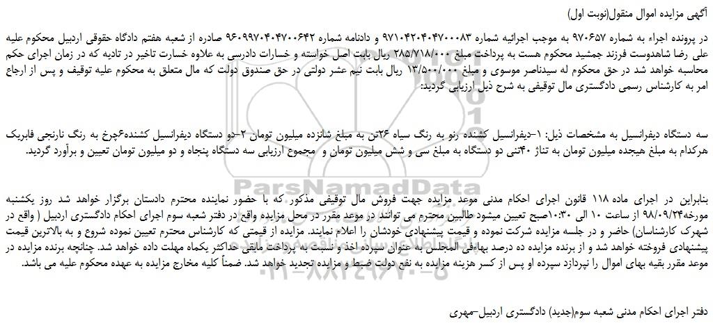 در پرونده اجراء به شماره 970657 به موجب اجرائیه شماره 9710420404700083 و دادنامه شماره 9609970404700642 صادره از شعبه هفتم دادگاه حقوقی اردبیل محکوم علیه علی رضا شاهدوست فرزند جمشید محکوم هست به پرداخت مبلغ 285/718/000 ریال بابت اصل خواسته و خسارات دادرسی به علاوه خسارت تاخیر در تادیه که در زمان اجرای حکم محاسبه خواهد شد در حق محکوم له سیدناصر موسوی و مبلغ 13/500/000 ریال بابت نیم عشر دولتی در حق صندوق دولت که مال متعلق به محکوم علیه توقیف و پس از ارجاع امر به کارشناس رسمی دادگستری مال توقیفی به شرح ذیل ارزیابی گردید:
