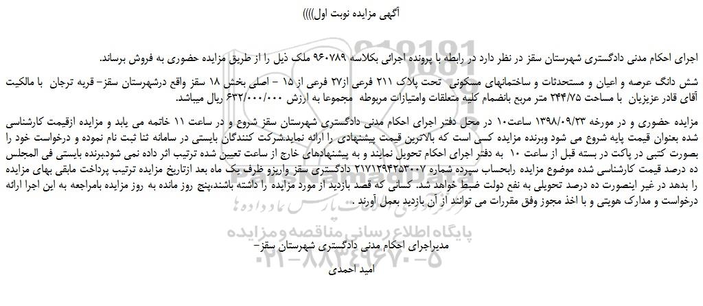 اجرای احکام مدنی دادگستری شهرستان سقز در نظر دارد در رابطه با پرونده اجرائی بکلاسه 960789 ملک ذیل را از طریق مزایده حضوری به فروش برساند.