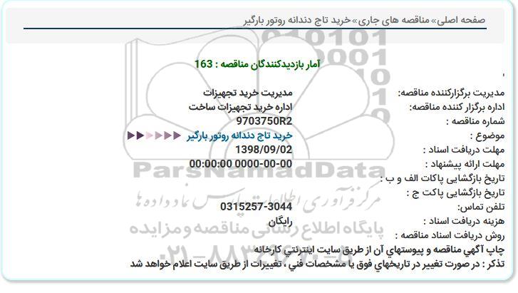 مناقصه خرید تاج دندانه روتور بارگیر از کلیه افراد متخصص و شرکتها واجد شرایط دعوت به عمل میآید در مناقصه با کد خبرگزاری پارس نماد: 2019523 شرکت نمایند.