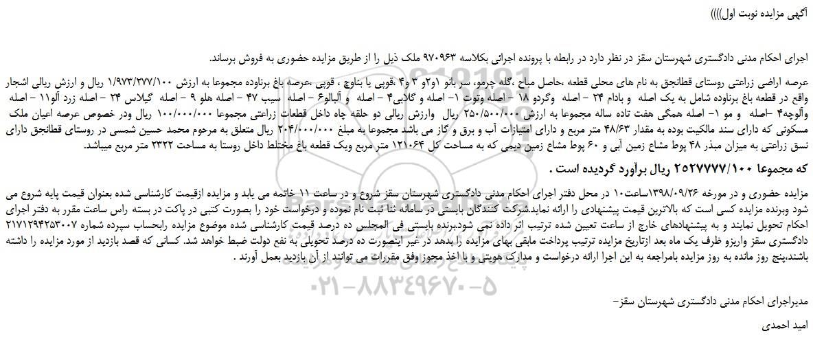 اجرای احکام مدنی دادگستری شهرستان سقز در نظر دارد در رابطه با پرونده اجرائی بکلاسه 970963 ملک ذیل را از طریق مزایده حضوری به فروش برساند.