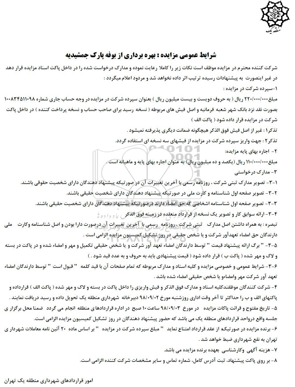 شرایط عمومی مزایده: بهره برداری از بوفه پارک جمشیدیه