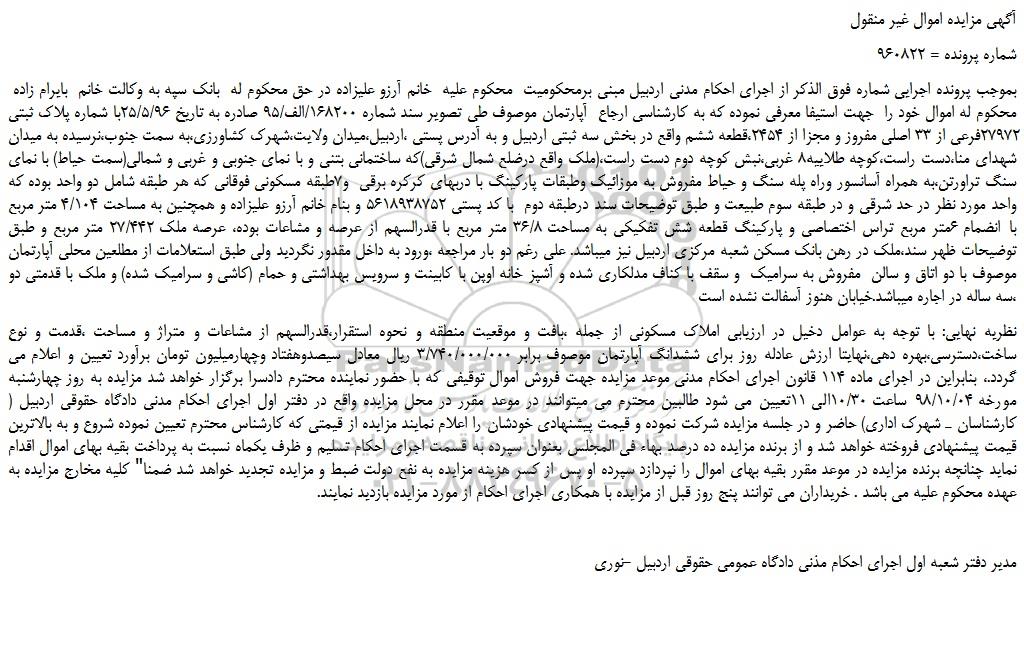 بموجب پرونده اجرایی شماره فوق الذکر از اجرای احکام مدنی اردبیل مبنی برمحکومیت محکوم علیه خانم آرزو علیزاده در حق محکوم له بانک سپه به وکالت خانم بایرام زاده محکوم له اموال خود را جهت استیفا معرفی نموده که به کارشناسی ارجاع آپارتمان موصوف طی تصویر سند شماره 168200/الف/95 صادره به تاریخ 25/5/96با شماره پلاک ثبتی 27972فرعی از 33 اصلی مفروز و مجزا از 2454،قطعه ششم واقع در بخش سه ثبتی اردبیل و به آدرس پستی ،اردبیل،میدان ولایت،شهرک کشاورزی،به سمت جنوب،نرسیده به میدان شهدای منا،دست راست،کوچه طلاییه8 غربی،نبش کوچه دوم دست راست،(ملک واقع درضلع شمال شرقی)که ساختمانی بتنی و با نمای جنوبی و غربی و شمالی(سمت حیاط) با نمای سنگ تراورتن،به همراه آسانسور وراه پله سنگ و حیاط مفروش به موزائیک وطبقات پارکینگ با دربهای کرکره برقی و7طبقه مسکونی فوقانی که هر طبقه شامل دو واحد بوده که واحد مورد نظر در حد شرقی و در طبقه سوم طبیعت و طبق توضیحات سند درطبقه دوم با کد پستی 5618938752 و بنام خانم آرزو علیزاده و همچنین به مساحت 4/104 متر مربع با انضمام 6متر مربع تراس اختصاصی و پارکینگ قطعه شش تفکیکی به مساحت 36/8 متر مربع با قدرالسهم از عرصه و مشاعات بوده، عرصه ملک 27/442 متر مربع و طبق توضیحات ظهر سند،ملک در رهن بانک مسکن شعبه مرکزی اردبیل نیز میباشد. علی رغم دو بار مراجعه ،ورود به داخل مقدور نگردید ولی طبق استعلامات از مطلعین محلی آپارتمان موصوف با دو اتاق و سالن مفروش به سرامیک و سقف با کناف مدلکاری شده و آشپز خانه اوپن با کابینت و سرویس بهداشتی و حمام (کاشی و سرامیک شده) و ملک با قدمتی دو ،سه ساله در اجاره میباشد.خیابان هنوز آسفالت نشده است