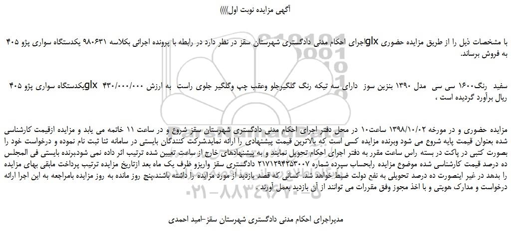 اجرای احکام مدنی دادگستری شهرستان سقز در نظر دارد در رابطه با پرونده اجرائی بکلاسه 980631 یکدستگاه سواری پژو 405 glx با مشخصات ذیل را از طریق مزایده حضوری به فروش برساند.
