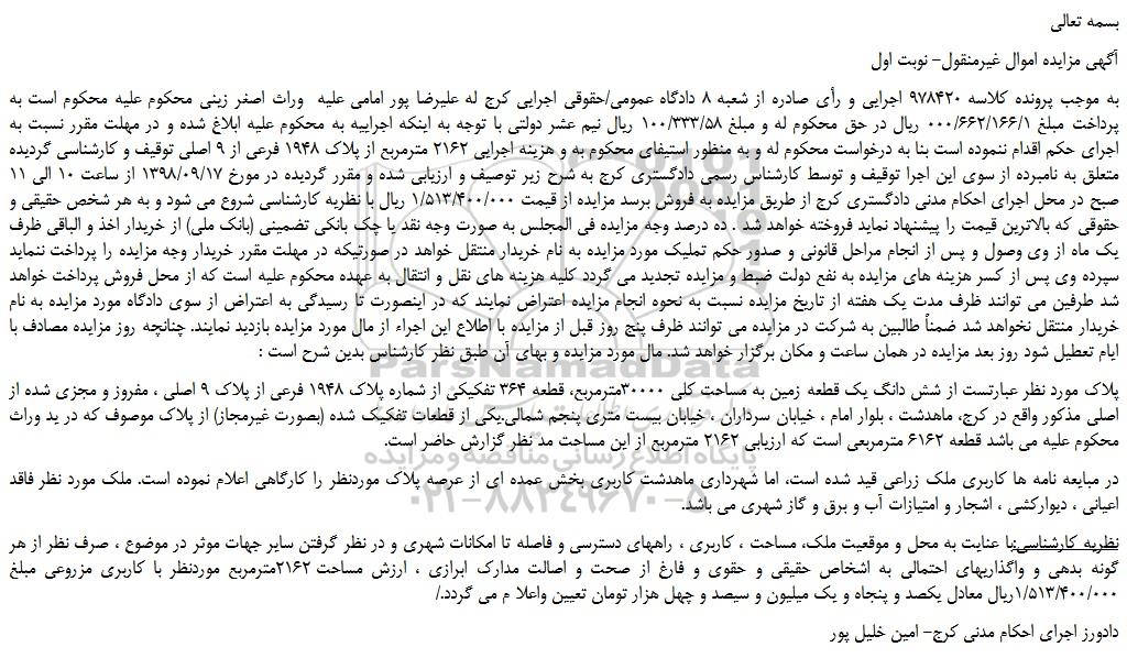 به موجب پرونده کلاسه 978420 اجرایی و رأی صادره از شعبه 8 دادگاه عمومی/حقوقی اجرایی کرج له علیرضا پور امامی علیه وراث اصغر زینی محکوم علیه محکوم است به پرداخت مبلغ 000/662/166/1 ریال در حق محکوم له و مبلغ 100/333/58 ریال نیم عشر دولتی با توجه به اینکه اجراییه به محکوم علیه ابلاغ شده و در مهلت مقرر نسبت به اجرای حکم اقدام ننموده است بنا به درخواست محکوم له و به منظور استیفای محکوم به و هزینه اجرایی 2162 مترمربع از پلاک 1948 فرعی از 9 اصلی توقیف و کارشناسی گردیده متعلق به نامبرده از سوی این اجرا توقیف و توسط کارشناس رسمی دادگستری کرج به شرح زیر توصیف و ارزیابی شده و مقرر گردیده در مورخ 1398/09/17 از ساعت 10 الی 11 صبح در محل اجرای احکام مدنی دادگستری کرج از طریق مزایده به فروش برسد مزایده از قیمت 1/513/400/000 ریال با نظریه کارشناسی شروع می شود و به هر شخص حقیقی و حقوقی که بالاترین قیمت را پیشنهاد نماید فروخته خواهد شد . ده درصد وجه مزایده فی المجلس به صورت وجه نقد یا چک بانکی تضمینی (بانک ملی) از خریدار اخذ و الباقی ظرف یک ماه از وی وصول و پس از انجام مراحل قانونی و صدور حکم تملیک مورد مزایده به نام خریدار منتقل خواهد در صورتیکه در مهلت مقرر خریدار وجه مزایده را پرداخت ننماید سپرده وی پس از کسر هزینه های مزایده به نفع دولت ضبط و مزایده تجدید می گردد کلیه هزینه های نقل و انتقال به عهده محکوم علیه است که از محل فروش پرداخت خواهد شد طرفین می توانند ظرف مدت یک هفته از تاریخ مزایده نسبت به نحوه انجام مزایده اعتراض نمایند که در اینصورت تا رسیدگی به اعتراض از سوی دادگاه مورد مزایده به نام خریدار منتقل نخواهد شد ضمناً طالبین به شرکت در مزایده می توانند ظرف پنج روز قبل از مزایده با اطلاع این اجراء از مال مورد مزایده بازدید نمایند. چنانچه روز مزایده مصادف با ایام تعطیل شود روز بعد مزایده در همان ساعت و مکان برگزار خواهد شد. مال مورد مزایده و بهای آن طبق نظر کارشناس بدین شرح است :