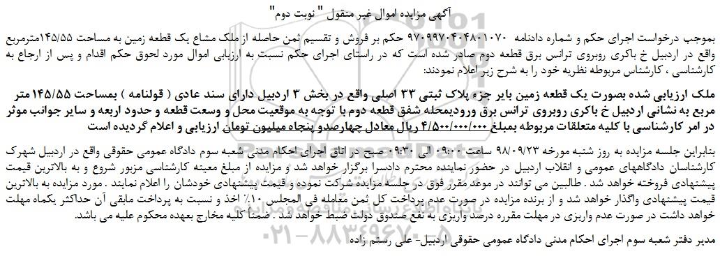 بموجب درخواست اجرای حکم و شماره دادنامه 9709970404801070 حکم بر فروش و تقسیم ثمن حاصله از ملک مشاع یک قطعه زمین به مساحت 145/55مترمربع واقع در اردبیل خ باکری روبروی ترانس برق قطعه دوم صادر شده است که در راستای اجرای حکم نسبت به ارزیابی اموال مورد لحوق حکم اقدام و پس از ارجاع به کارشناسی ، کارشناس مربوطه نظریه خود را به شرح زیر اعلام نمودند: