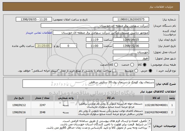 شرح کلی نیاز: دستمال رول کوچک و دستمال رول 20 سانتی سافتلن