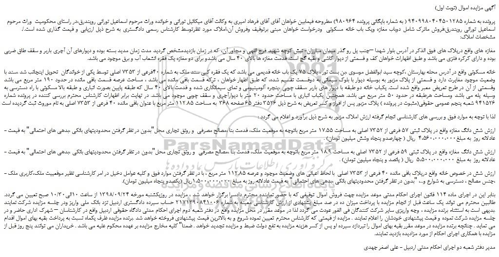 پرونده به شماره 9409980404501285 ( به شماره بایگانی پرونده 980964) مطروحه فیمابین خواهان آقای آقای فرهاد امیری به وکالت آقای میکائیل نورانی و خوانده وراث مرحوم اسماعیل نورانی رویندرق،در راستای محکومیت وراث مرحوم اسماعیل نورانی رویندرق:فروش ماترک شامل دوباب مغازه ویک باب خانه مسکونی ودرخواست خواهان مبنی برتوقیف وفروش آن،املاک مورد نظرتوسط کارشناس رسمی دادگستری به شرح ذیل ارزیابی و قیمت گذاری شده است./. مشخصات املاک: