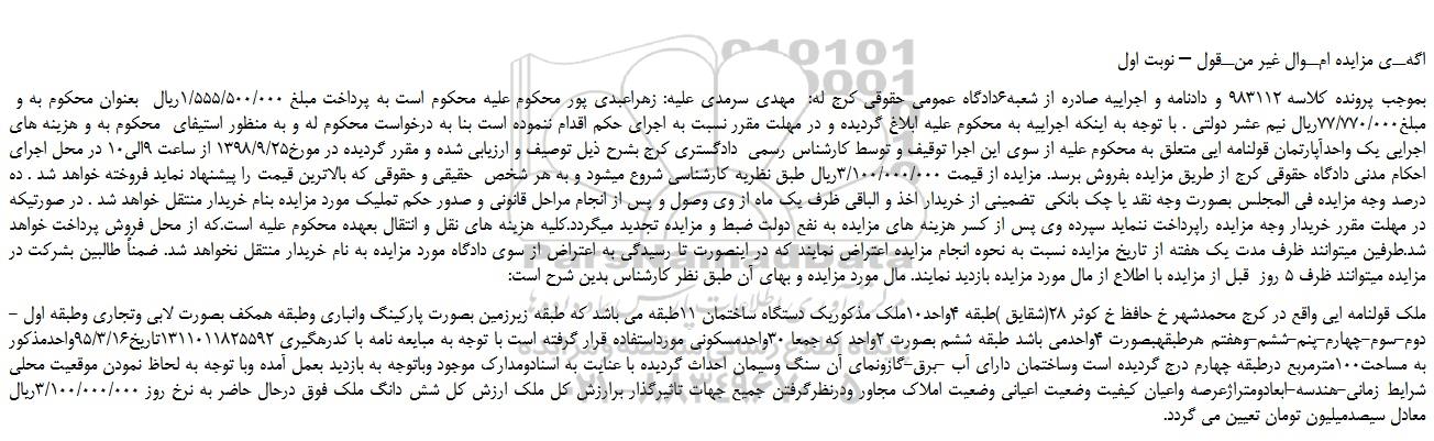 بموجب پرونده کلاسه 983112 و دادنامه و اجراییه صادره از شعبه6دادگاه عمومی حقوقی کرج له:  مهدی سرمدی علیه: زهراعبدی پور محکوم علیه محکوم است به پرداخت مبلغ 1/555/500/000ریال  بعنوان محکوم به و مبلغ77/770/000ریال نیم عشر دولتی . با توجه به اینکه اجراییه به محکوم علیه ابلاغ گردیده و در مهلت مقرر نسبت به اجرای حکم اقدام ننموده است بنا به درخواست محکوم له و به منظور استیفای  محکوم به و هزینه های اجرایی یک واحدآپارتمان قولنامه ایی متعلق به محکوم علیه از سوی این اجرا توقیف و توسط کارشناس رسمی  دادگستری کرج بشرح ذیل توصیف و ارزیابی شده و مقرر گردیده در مورخ1398/9/25 از ساعت 9الی10 در محل اجرای احکام مدنی دادگاه حقوقی کرج از طریق مزایده بفروش برسد. مزایده از قیمت 3/100/000/000ریال طبق نظریه کارشناسی شروع میشود و به هر شخص  حقیقی و حقوقی که بالاترین قیمت را پیشنهاد نماید فروخته خواهد شد . ده درصد وجه مزایده فی المجلس بصورت وجه نقد یا چک بانکی  تضمینی از خریدار اخذ و الباقی ظرف یک ماه از وی وصول و پس از انجام مراحل قانونی و صدور حکم تملیک مورد مزایده بنام خریدار منتقل خواهد شد . در صورتیکه در مهلت مقرر خریدار وجه مزایده راپرداخت ننماید سپرده وی پس از کسر هزینه های مزایده به نفع دولت ضبط و مزایده تجدید میگردد.کلیه هزینه های نقل و انتقال بعهده محکوم علیه است.که از محل فروش پرداخت خواهد شد.طرفین میتوانند ظرف مدت یک هفته از تاریخ مزایده نسبت به نحوه انجام مزایده اعتراض نمایند که در اینصورت تا رسیدگی به اعتراض از سوی دادگاه مورد مزایده به نام خریدار منتقل نخواهد شد. ضمناً طالبین بشرکت در مزایده میتوانند ظرف 5 روز  قبل از مزایده با اطلاع از مال مورد مزایده بازدید نمایند. مال مورد مزایده و بهای آن طبق نظر کارشناس بدین شرح است: