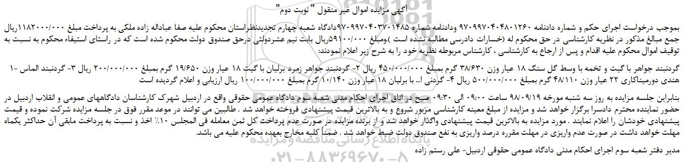 بموجب درخواست اجرای حکم و شماره دادنامه 9709970404801260 ودادنامه شماره 9709970403701485دادگاه شعبه چهارم تجدیدنظراستان محکوم علیه صفا عباداله زاده ملکی به پرداخت مبلغ 1182000/000ریال جمع مبالغ مذکور در نظریه کارشناسی در حق محکوم له (خسارات دادرسی مطالبه نشده است ).ومبلغ 59100/000ریال بابت نیم عشردولتی درحق صندوق دولت محکوم شده است که در راستای استیفاء محکوم به نسبت به توقیف اموال محکوم علیه اقدام و پس از ارجاع به کارشناسی ، کارشناس مربوطه نظریه خود را به شرح زیر اعلام نمودند:
