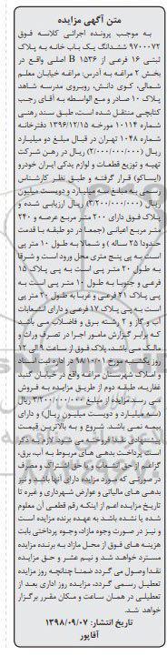 آگهی مزایده, مزایده خانه به پلاک ثبتی 16 فرعی از 1536 b اصلی