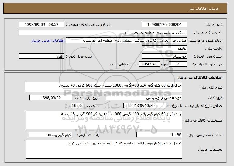 مشخصات کالای مورد نیاز: چای قرمز 60 کیلو گرم وقند 400 گرمی 1080 بسته وشکر 900 گرمی 48 بسته .