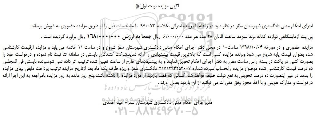 اجرای احکام مدنی دادگستری شهرستان سقز در نظر دارد در رابطه با پرونده اجرائی بکلاسه 970073 با مشخصات ذیل را از طریق مزایده حضوری به فروش برساند.