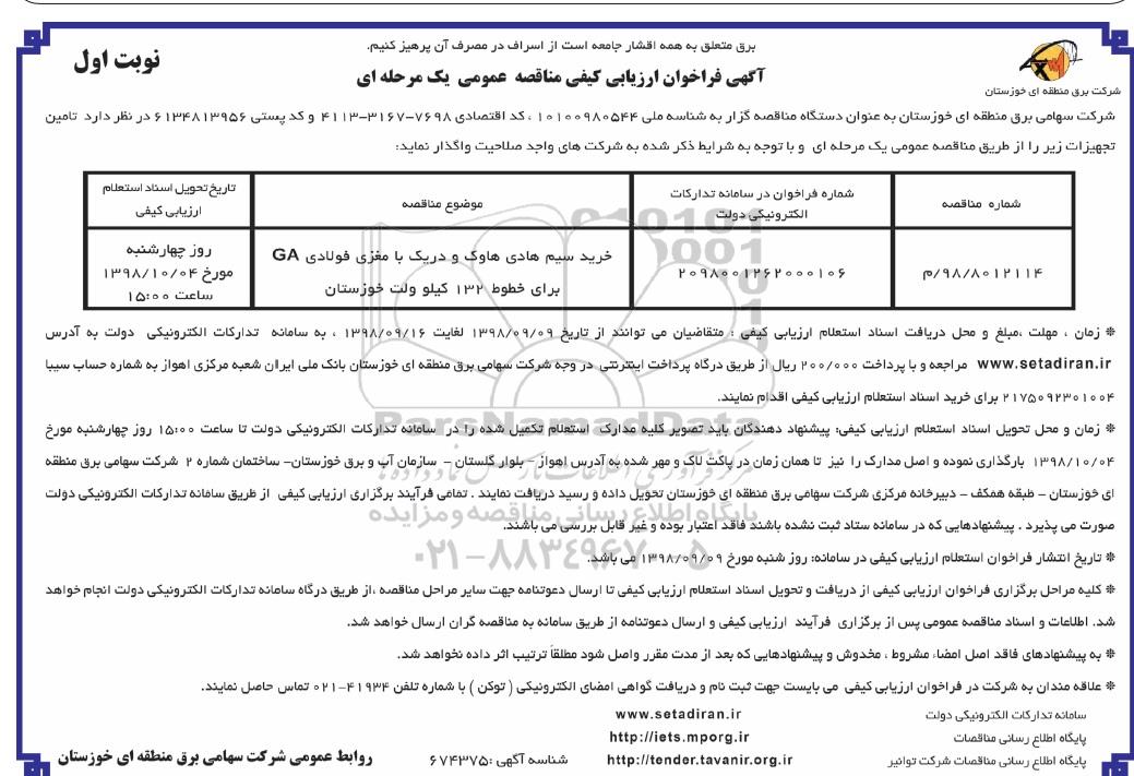 | 8012114/ 98 / م | 2098001262000106 | خرید سیم هادی هاوک و دریک با مغزی فولادی GA برای خطوط 132 کیولولت خوزستان | روز چهارشنبه مورخ 98.10.04 ساعت 15 |
