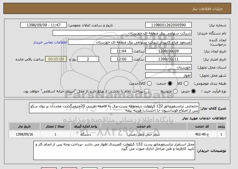 شرح کلی نیاز: جابجایی ترانسفورماتور 132 کیلوولت درمحوطه پست برق به فاصله تقریبی 20متروبرگشت مجددآن بر روی سکو پس از اصلاح فونداسیون -با احتساب هزینه بیمه