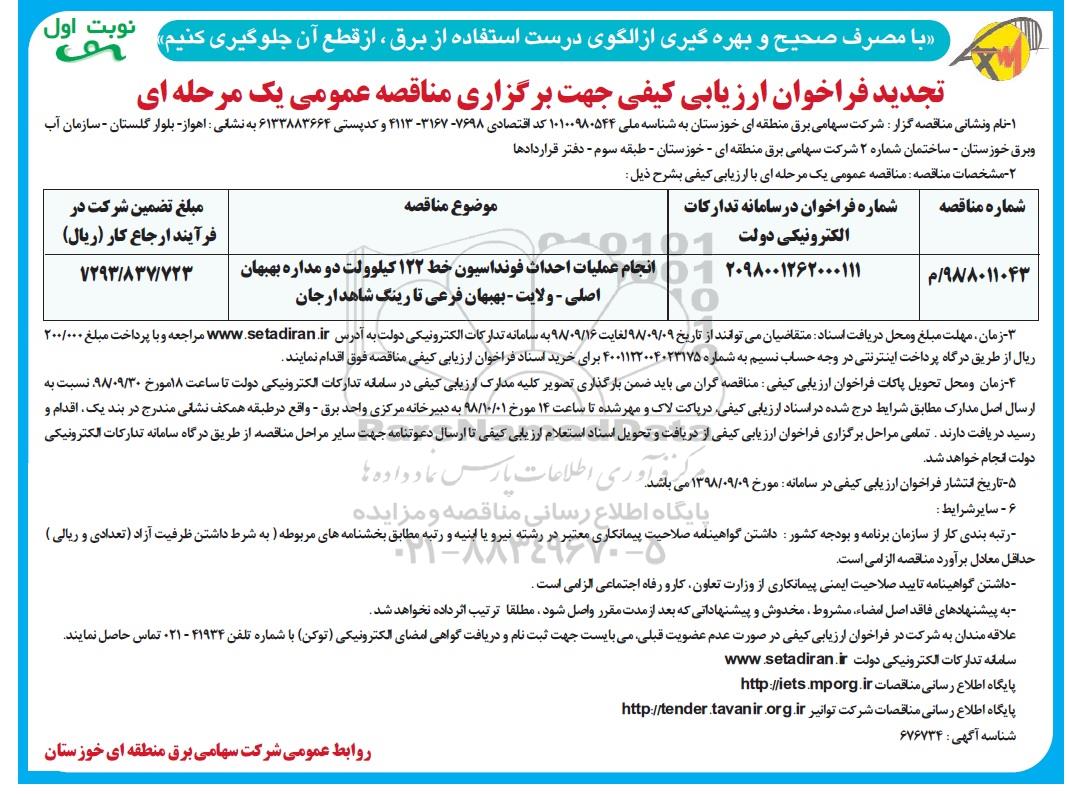 | 98/8011043/م | 2098001262000111 | انجام عملیات احداث فونداسیون خط 122 کیوولت دو مداره بهبهان اصلی - ولایت بهبهان فرعی تا رینگ شاهد، ارجان |