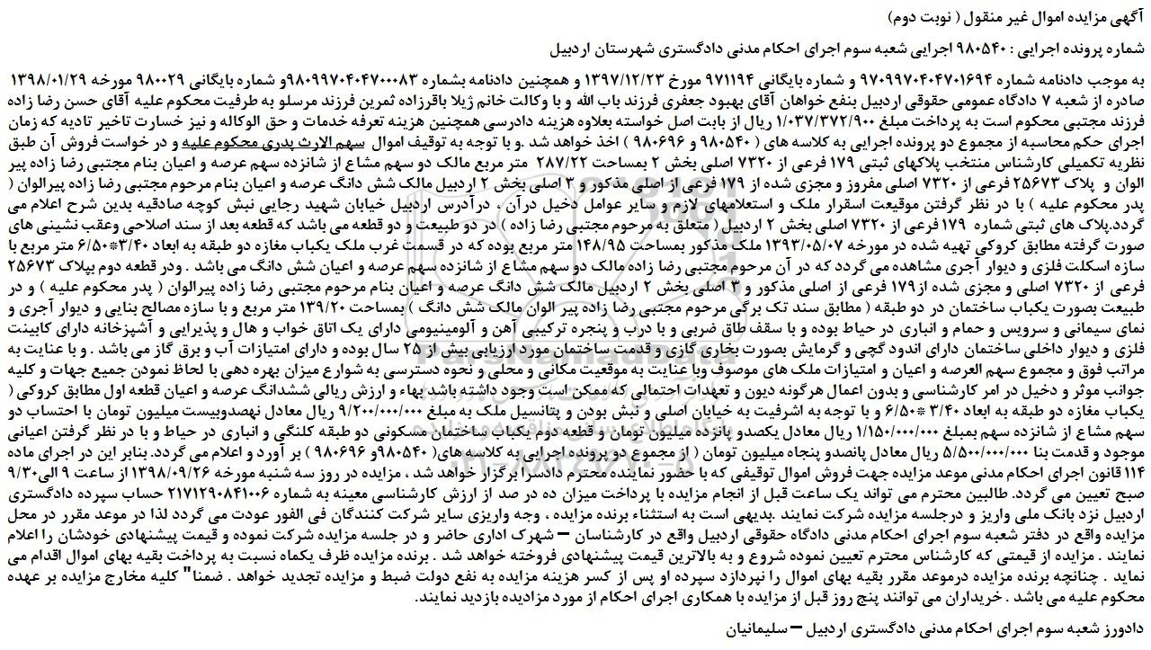 شماره پرونده اجرایی : 980540 اجرایی شعبه سوم اجرای احکام مدنی دادگستری شهرستان اردبیل
