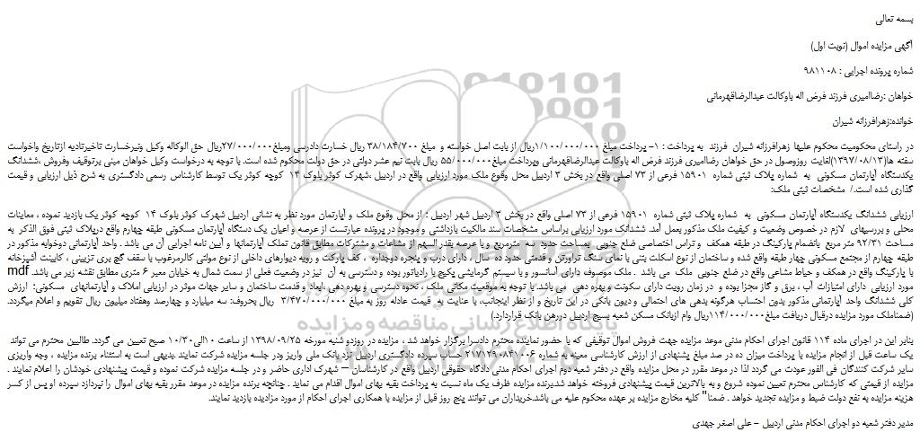 در راستای محکومیت محکوم علیها زهرافرزانه شیران  فرزند  به پرداخت : 1- پرداخت مبلغ 1/100/000/000ریال از بابت اصل خواسته و  مبلغ 38/184/700 ریال خسارت دادرسی ومبلغ27/000/000ریال حق الوکاله وکیل ونیرخسارت تاخیرتادیه ازتاریخ واخواست سفته ها(1397/08/13)لغایت روزوصول در حق خواهان رضاامیری فرزند فرض اله باوکالت عبدالرضاقهرمانی وپرداخت مبلغ55/000/000 ریال بابت نیم عشر دولتی در حق دولت محکوم شده است. با توجه به درخواست وکیل خواهان مبنی برتوقیف وفروش ،ششدانگ یکدستگاه آپارتمان مسکونی  به  شماره پلاک ثبتی شماره  15901 فرعی از 73 اصلی واقع در بخش 3 اردبیل محل وقوع ملک مورد ارزیابی واقع در اردبیل ،شهرک کوثر بلوک 14  کوچه کوثر یک توسط کارشناس رسمی دادگستری به شرح ذیل ارزیابی و قیمت گذاری شده است./  مشخصات ثبتی ملک: