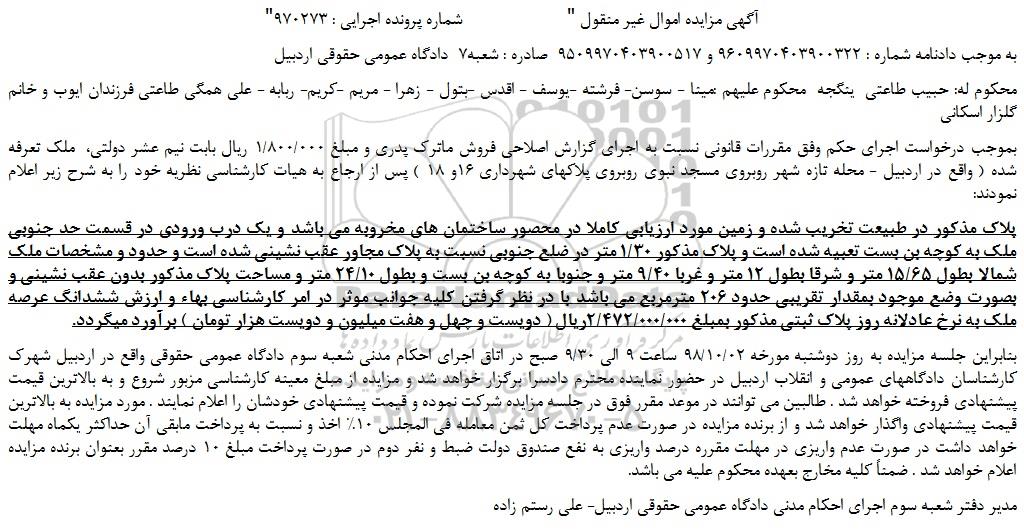 "آگهی مزایده اموال غیر منقول " شماره پرونده اجرایی : 970273