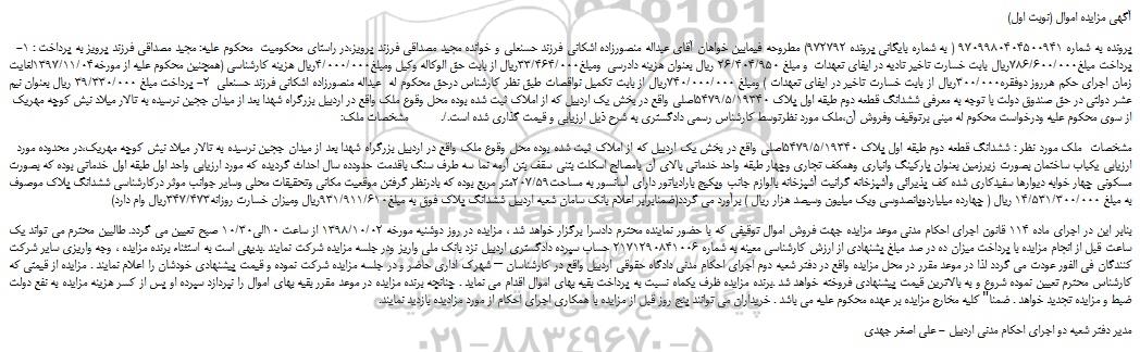 پرونده به شماره 9709980404500941 ( به شماره بایگانی پرونده 972792) مطروحه فیمابین خواهان آقای عبداله منصورزاده اشکانی فرزند حسنعلی و خوانده مجید مصداقی فرزند پرویز،در راستای محکومیت  محکوم علیه: مجید مصداقی فرزند پرویز به پرداخت : 1- پرداخت مبلغ786/600/000ریال بابت خسارت تاخیر تادیه در ایفای تعهدات  و مبلغ 26/404/950 ریال بعنوان هزینه دادرسی  ومبلغ33/464/000ریال از بابت حق الوکاله وکیل ومبلغ4/000/000ریال هزینه کارشناسی (همچنین محکوم علیه از مورخه1397/11/04لغایت زمان اجرای حکم هرروز دوفقره300/000ریال از بابت خسارت تاخیر در ایفای تعهدات ) ومبلغ 740/000/000ریال از بابت تکمیل نواقصات طبق نظر کارشناس درحق محکوم له  عبداله منصورزاده اشکانی فرزند حسنعلی  2- پرداخت مبلغ 39/330/000 ریال بعنوان نیم عشر دولتی در حق صندوق دولت با توجه به معرفی ششدانگ قطعه دوم طبقه اول پلاک 5479/5/19340اصلی واقع در بخش یک اردبیل که از املاک ثبت شده بوده محل وقوع ملک واقع در اردبیل بزرگراه شهدا بعد از میدان ججین نرسیده به تالار میلاد نبش کوچه مهریک  از سوی محکوم علیه ودرخواست محکوم له مبنی برتوقیف وفروش آن،ملک مورد نظرتوسط کارشناس رسمی دادگستری به شرح ذیل ارزیابی و قیمت گذاری شده است./.          مشخصات ملک: