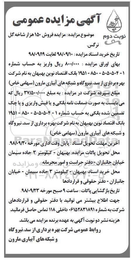 بهای اوراق مزایده 800.000 ریال واریز به حساب شماره 1-5050504-850-1951 بانک اقتصاد نوین بهبهان به نام شرکت بهره برداری از سد نیروگاه و شبکه های آبیاری مارون (سهامی خاص)