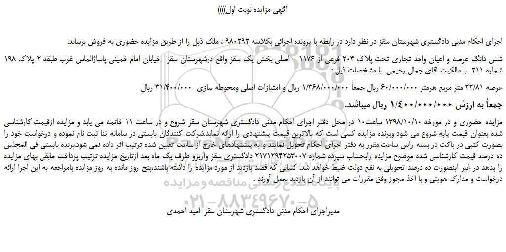 مزایده فروش شش دانگ عرصه و اعیان واحد تجاری تحت پلاک 204 فرعی از 1176 - اصلی , مزایده، مزایده فروش شش دانگ عرصه و اعیان واحد تجاری تحت پلاک 204 فرعی از 1176 - اصلی