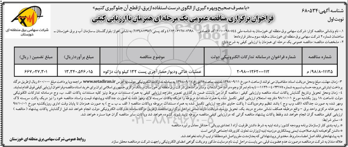 98/8011125/ م 2098001262000112 عملیات خاکی و دیوار حصار آجری پست 132 کیلووات دژکوه  13.340.546.015 667.027.301