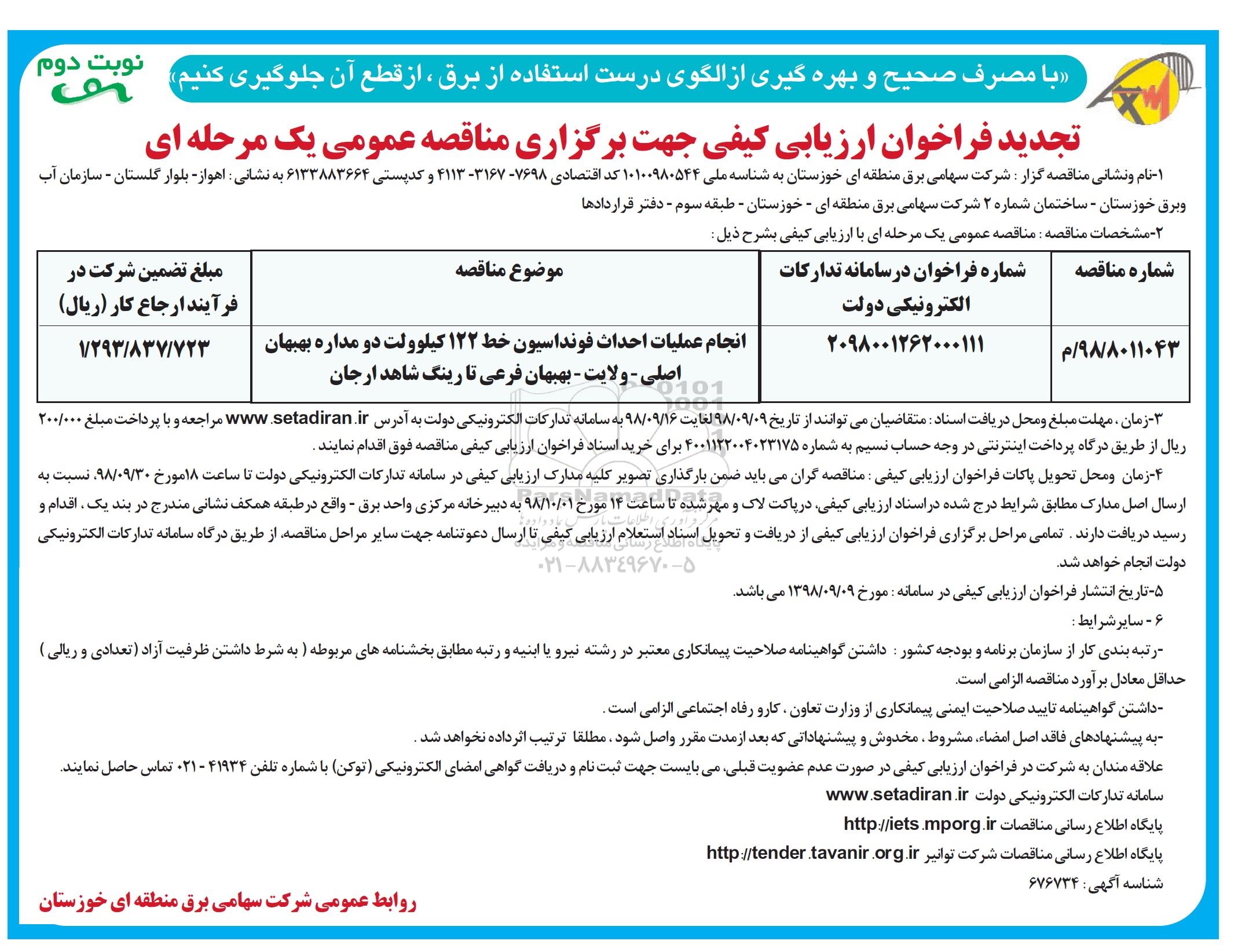 | 98/8011043/م | 2098001262000111 | انجام عملیات احداث فونداسیون خط 122 کیوولت دو مداره بهبهان اصلی - ولایت بهبهان فرعی تا رینگ شاهد، ارجان |