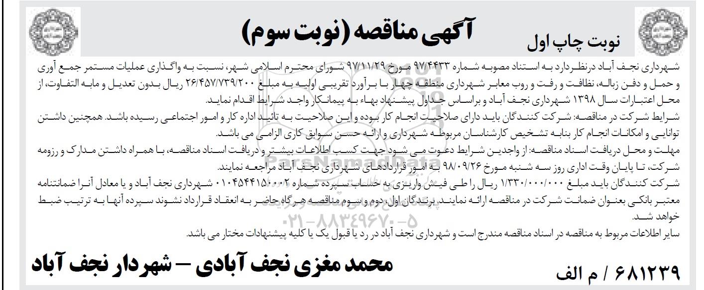 شماره 0104544150002 شهرداری نجف آباد و یا معادل آن را ضمانت نامه معتبر