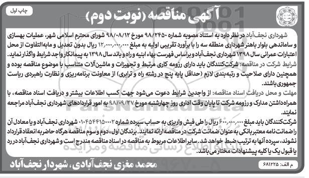 شهرداری نجف آباد در نظر دارد به استناد مصوبه شماره 28.2450 مورخ 98.8.12 شورای محترم اسلامی شهر، عملیات بهسازی و ساماندهی بلوار باهنر شهرداری منطقه سه را با برآورد تقریبی اولیه به مبلغ 12.000.000.000 ریال بدون تعدیل و مابه التفاوت، از محل اعتبارات عمرانی سال 1398 شهرداری نجف آباد و براساس فهرست بها ابنیه و راه و باند سال 1398 به پیمانکار واجد شرایط واگذار نماید.