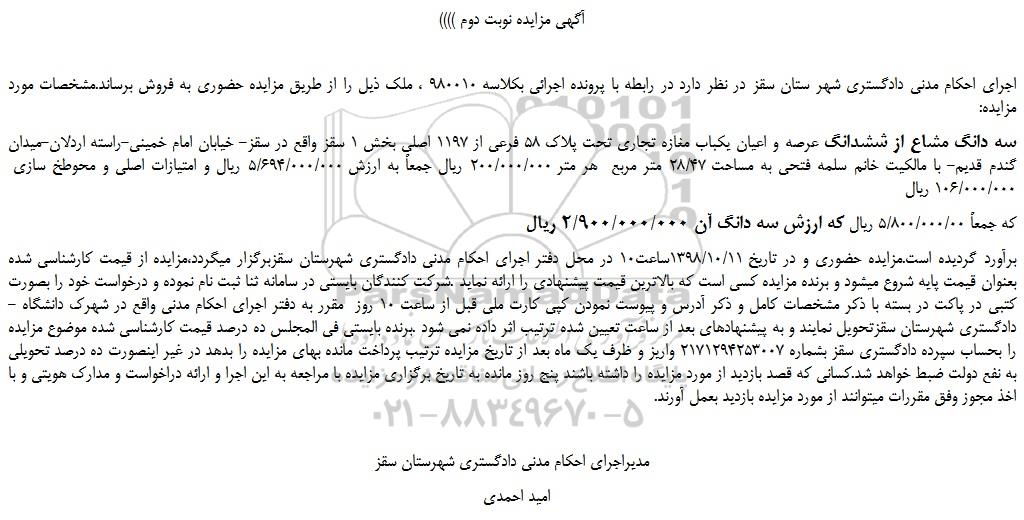 اجرای احکام مدنی دادگستری شهر ستان سقز در نظر دارد در رابطه با پرونده اجرائی بکلاسه 980010 ، ملک ذیل را از طریق مزایده حضوری به فروش برساند.مشخصات مورد مزایده: