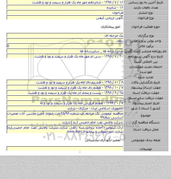 مناقصه عمومی یک مرحله ای شماره ۲۵/۹۸تحت عنوان تأمین ماشین آلات تعمیرات اساسی سال۹۹