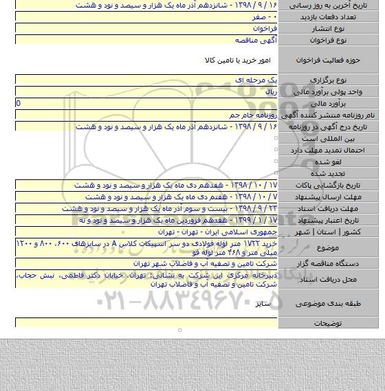 این مناقصه در استان تهران با دسته بندی های صنفی و تخصصی لوله و اتصالات, لوله های فولادی و چدنی برگزار میشود.