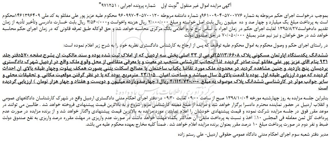 "آگهی مزایده اموال غیر منقول "نوبت اول    شماره پرونده اجرایی : 971251