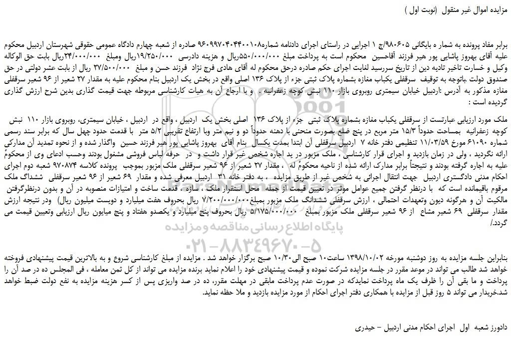 برابر مفاد پرونده به شمار ه بایگانی 980605/ج 1 اجرایی در راستای اجرای دادنامه شماره9609970404400108 صادره از شعبه چهارم دادگاه عمومی حقوقی شهرستان اردبیل محکوم علیه آقای بهروز پاشایی پور هیر فرزند آقاحسین محکوم است به پرداخت مبلغ 550/000/000ریال و هزینه دادرسی 19/250/000ریال ومبلغ 24/000/000ریال بابت حق الوکاله وکیل و خسارت تاخیر تادیه دین از تاریخ سررسید لغایت اجرای حکم صادره درحق محکوم له آقای هادی فرج نژاد فرزند حسن و مبلغ 27/500/000 ریال از بابت عشر دولتی در حق صندوق دولت .باتوجه به توقیف سرقفلی یکباب مغازه بشماره پلاک ثبتی جزء از پلاک 136 اصلی واقع در بخش یک اردبیل بنام محکوم علیه به مقدار 27 شعیر از 96 شعیر سرقفلی مغازه مذکور به آدرس :اردبیل خیابان سیمتری روبروی بازار 110 نبش کوچه زعفرانیه . و با ارجاع آن به هیات کارشناسی مربوطه جهت قیمت گذاری بدین شرح ارزش گذاری گردیده است :