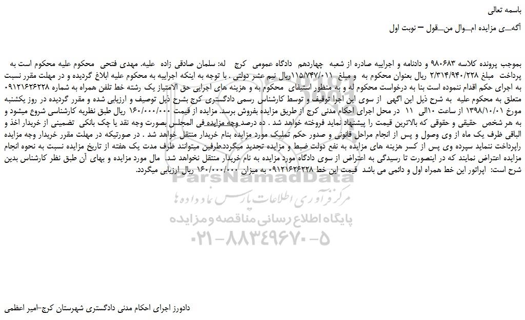 بموجب پرونده کلاسه 980683 و دادنامه و اجراییه صادره از شعبه چهاردهم دادگاه عمومی کرج له: سلمان صادقی زاده علیه. مهدی فتحی محکوم علیه محکوم است به پرداخت مبلغ 2/314/940/228 ریال بعنوان محکوم به و مبلغ 115/747/011ریال نیم عشر دولتی . با توجه به اینکه اجراییه به محکوم علیه ابلاغ گردیده و در مهلت مقرر نسبت به اجرای حکم اقدام ننموده است بنا به درخواست محکوم له و به منظور استیفای محکوم به و هزینه های اجرایی حق الامتیاز یک رشته خط تلفن همراه به شماره 09121626228 متعلق به محکوم علیه به شرح ذیل این اگهی از سوی این اجرا توقیف و توسط کارشناس رسمی دادگستری کرج بشرح ذیل توصیف و ارزیابی شده و مقرر گردیده در روز یکشنبه مورخ 1398/10/01 از ساعت 10الی 11 در محل اجرای احکام مدنی کرج از طریق مزایده بفروش برسد. مزایده از قیمت 160/000/000 ریال طبق نظریه کارشناسی شروع میشود و به هر شخص حقیقی و حقوقی که بالاترین قیمت را پیشنهاد نماید فروخته خواهد شد . ده درصد وجه مزایده فی المجلس بصورت وجه نقد یا چک بانکی تضمینی از خریدار اخذ و الباقی ظرف یک ماه از وی وصول و پس از انجام مراحل قانونی و صدور حکم تملیک مورد مزایده بنام خریدار منتقل خواهد شد . در صورتیکه در مهلت مقرر خریدار وجه مزایده راپرداخت ننماید سپرده وی پس از کسر هزینه های مزایده به نفع دولت ضبط و مزایده تجدید میگردد.طرفین میتوانند ظرف مدت یک هفته از تاریخ مزایده نسبت به نحوه انجام مزایده اعتراض نمایند که در اینصورت تا رسیدگی به اعتراض از سوی دادگاه مورد مزایده به نام خریدار منتقل نخواهد شد. مال مورد مزایده و بهای آن طبق نظر کارشناس بدین شرح است: اپراتور این خط همراه اول و دائمی می باشد قیمت این خط 09121626228 به میزان 160/000/000 ریال ارزیابی میگردد.