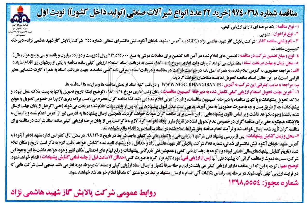 3- نام و نشانی مناقصه گذار: شرکت پالایش گاز شهید هاشمی نژاد (SGPC) به آدرس : مشهد خیابان آبکوه نبش دانشسرای شمالی شماره 255 شرکت پالایش گاز شهید هاشمی نژاد دبیرخانه کمیسیون مناقصات