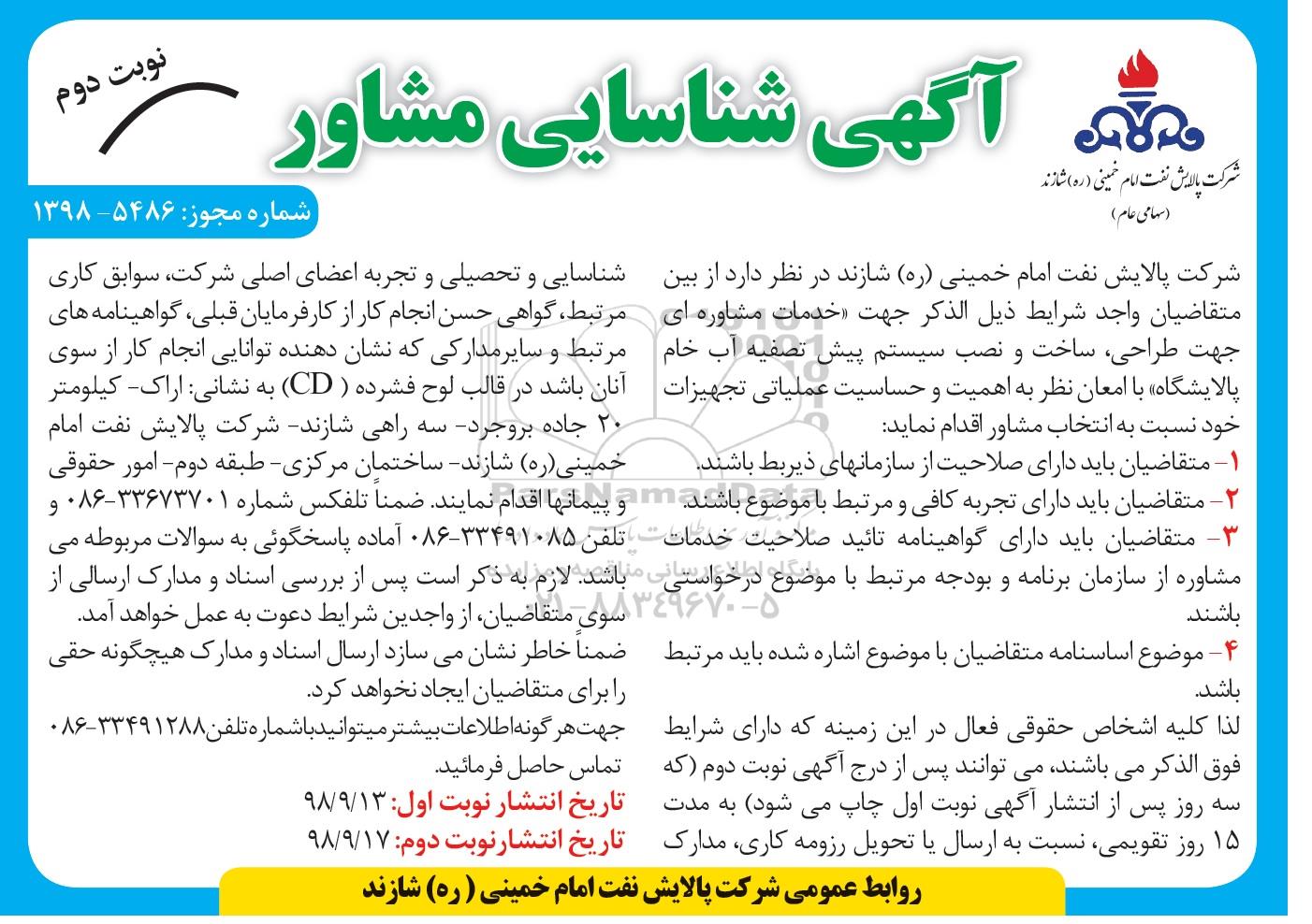 شرکت پالایش نفت امام خمینی (ره) شازند در نظر دارد از بین متقاضیان واجد شرایط ذیل الذکر خدمات مشاوره ای جهت طراحی، ساخت و نصب سیستم پیش تصفیه آب خام پالایشگاه با امعان نظر به اهمیت وحساسیت عملیاتی تجهیزات خود نسبت به انتخاب مشاور اقدام نماید: