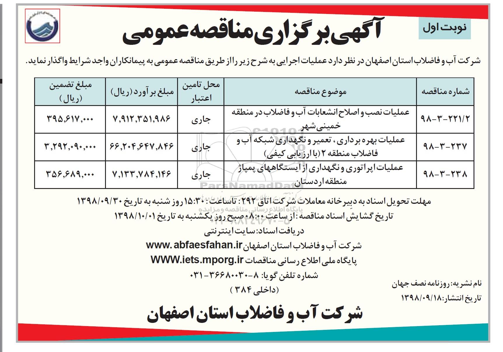 98-3-238 عملیات اپراتوری و نگهداری از ایستگاه های پمپاژ منطقه اردستان  جاری 7.133.784.146 356.689.000
