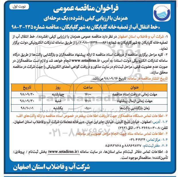 خط انتقال آب از تصفیه خانه گلپایگان به شهر گلپایگان مناقصه شماره 235 - 3 - 98