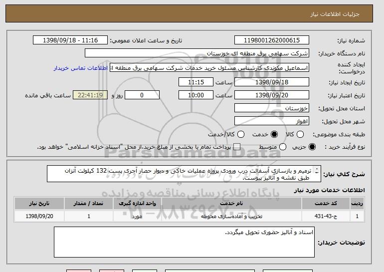 شرح کلی نیاز: ترمیم و بازسازی آسفالت درب ورودی پروژه عملیات خاکی و دیوار حصار آجری پست 132 کیلولت آنزان