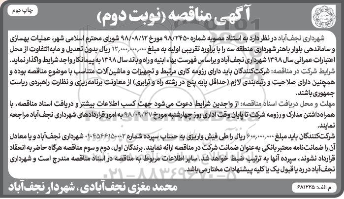 شهرداری نجف آباد در نظر دارد به استناد مصوبه شماره 28.2450 مورخ 98.8.12 شورای محترم اسلامی شهر، عملیات بهسازی و ساماندهی بلوار باهنر شهرداری منطقه سه را با برآورد تقریبی اولیه به مبلغ 12.000.000.000 ریال بدون تعدیل و مابه التفاوت، از محل اعتبارات عمرانی سال 1398 شهرداری نجف آباد و براساس فهرست بها ابنیه و راه و باند سال 1398 به پیمانکار واجد شرایط واگذار نماید.