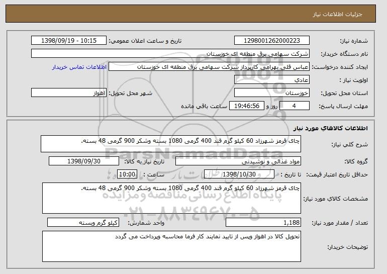 شرح کلی نیاز: چای قرمز شهرزاد 60 کیلو گرم قند 400 گرمی 1080 بسته وشکر 900 گرمی 48 بسته.