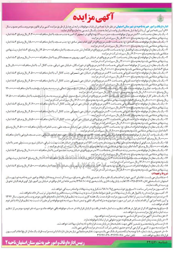 سازمان فرهنگی، اجتماعی و ورزشی شهرداری نجف آباد در نظر دارد اماکن زیر را با شرایط و مشخصات موجود از طریق مزایده به افراد واجد شرایط واگذار ننماید